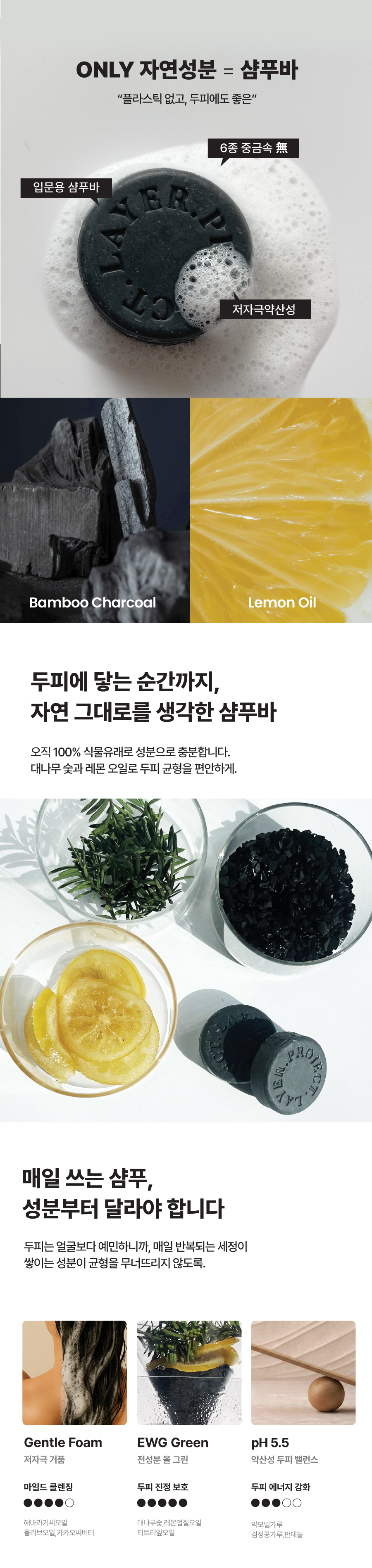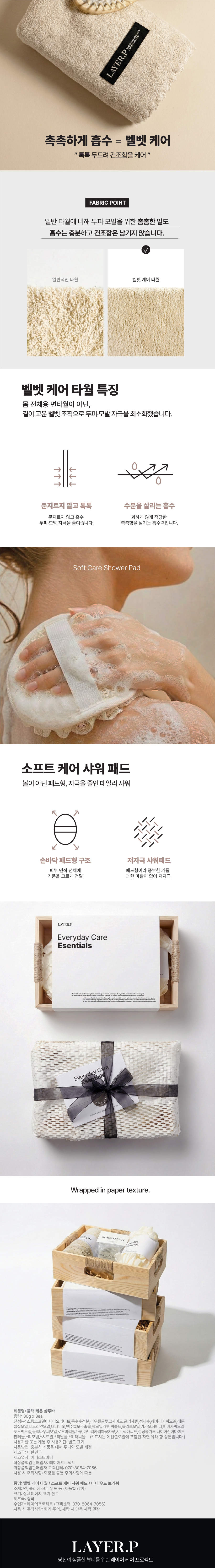 매일 쓰는 것들로 구성한 레이어프의 에센셜 기프트샴푸 바 · 타월 · 샤워 패드 · 우드 브러시